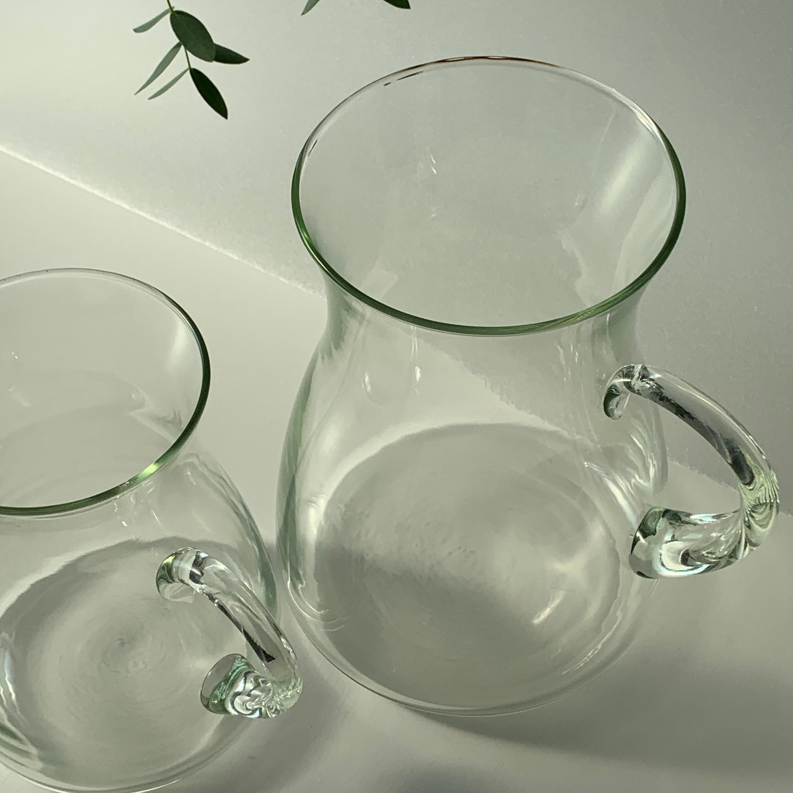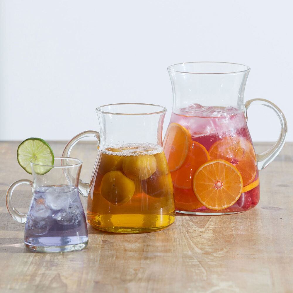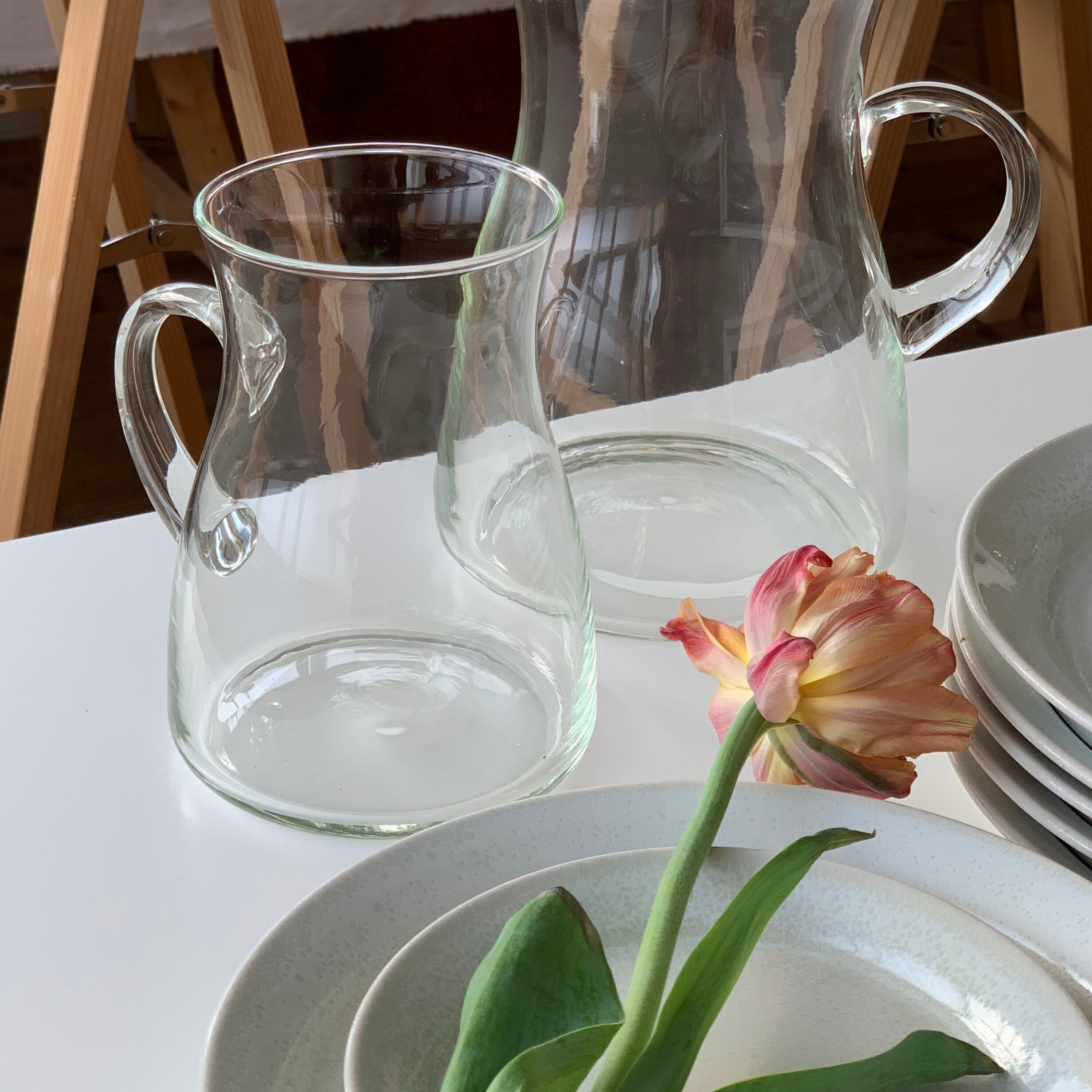 持ち手付きで開口部の広いのフラワーベースは安定感抜群で、ボリュームのある花でも安心して飾ることができます。フルーツを入れてサングリアや、梅ソーダーなどのカラフェとしても。