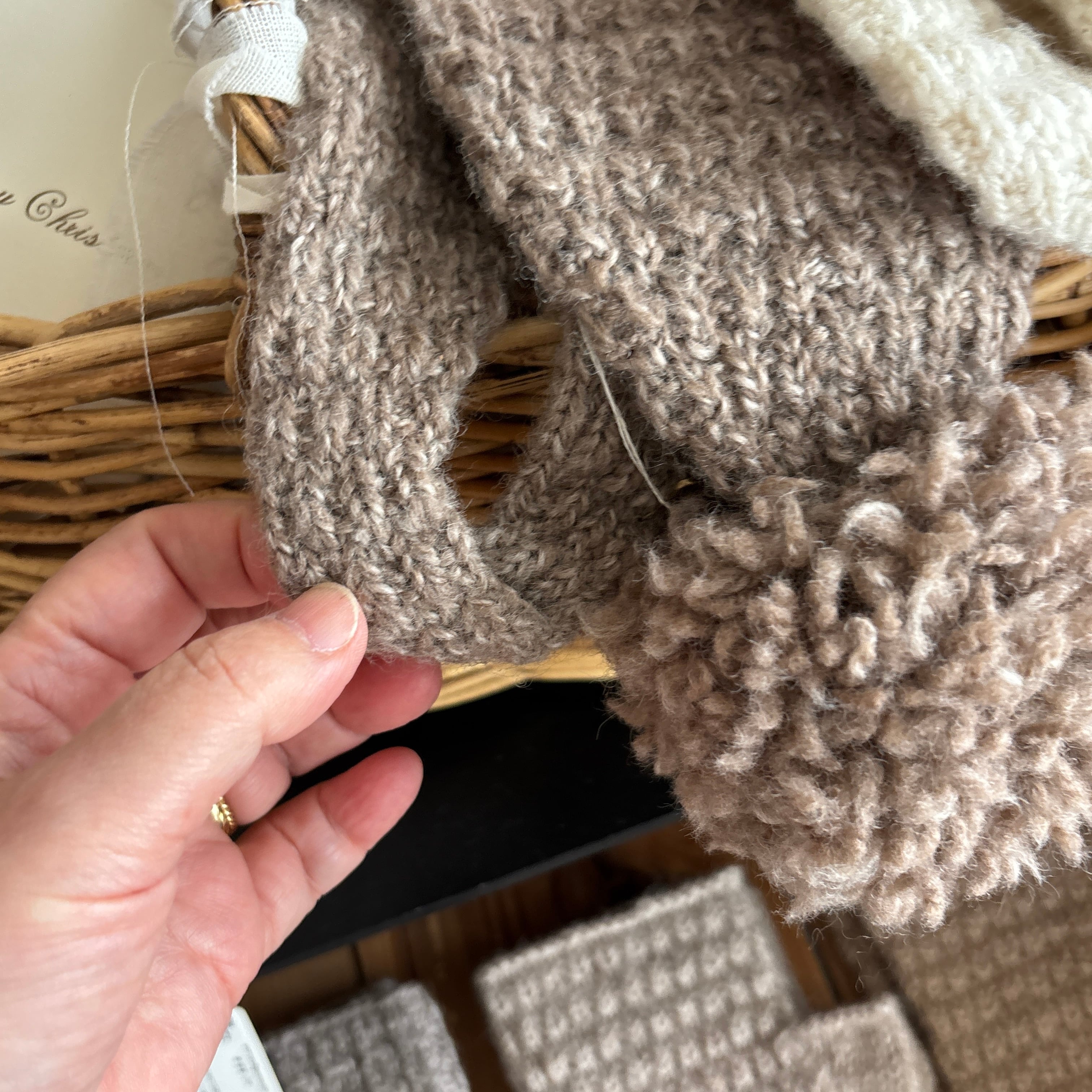 羊毛は化学処理をしていないため、おがくずが混在している場合がございます。羊毛本来の色味で手紡ぎした糸を使い、手編みでひとつずつ編み上げております。肌に馴染んでいく風合いをお楽しみください。