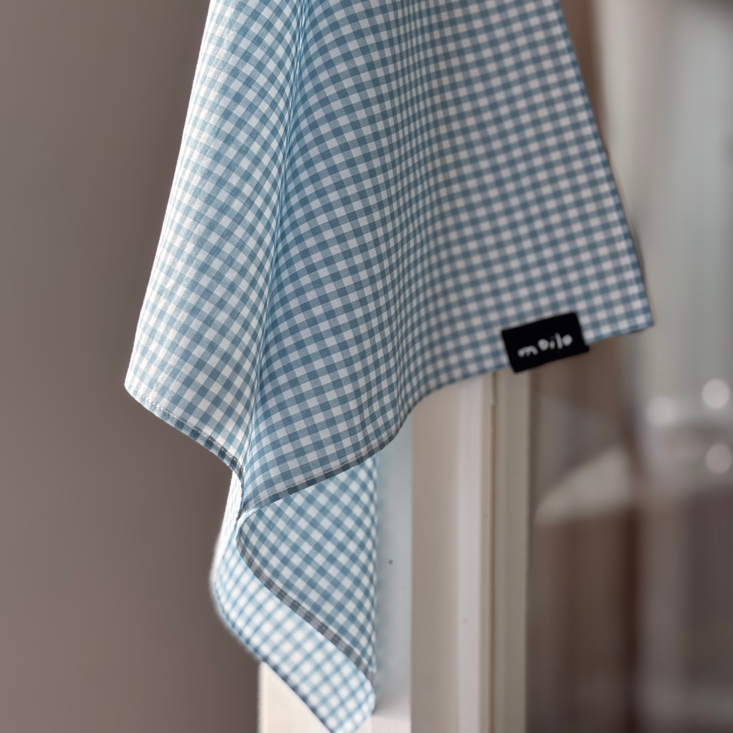 春らしい水色のギンガムチェックのハンカチにワンポイント刺繍が施されています。