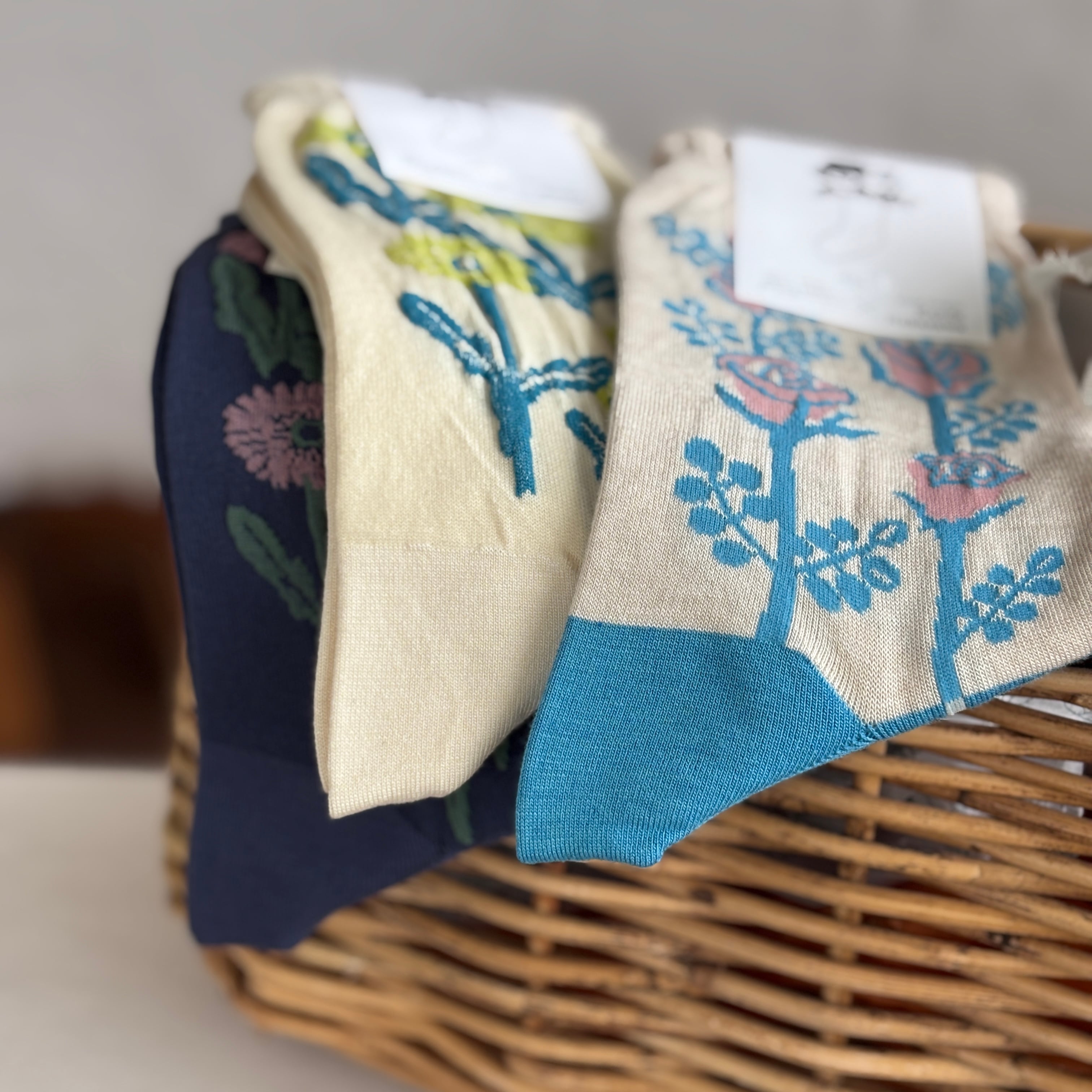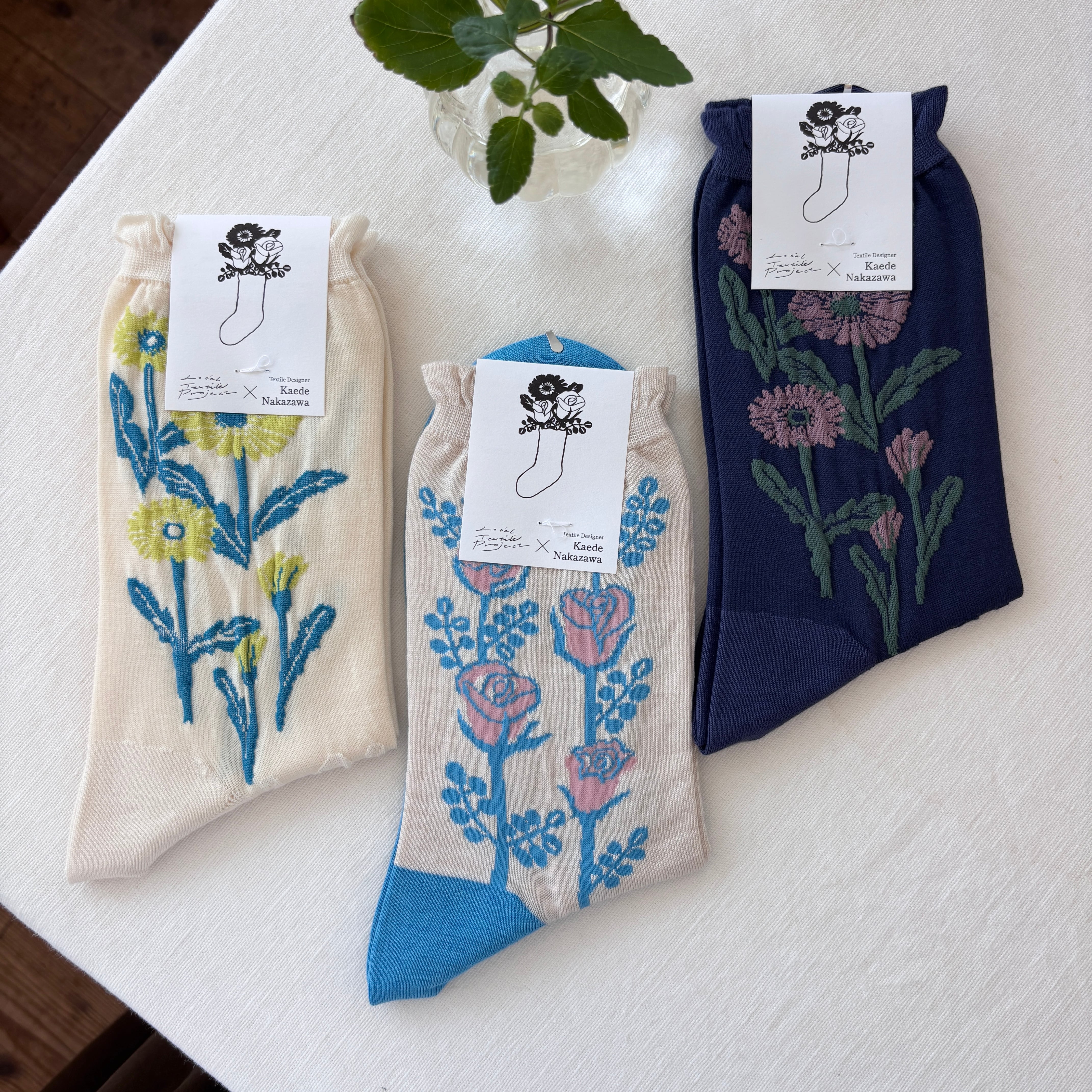 サンダルやスニーカーから覗く、ガーベラやバラをあしらった繊細な編み柄が、毎日のコーディネートにさりげない華やかさをプラスします。