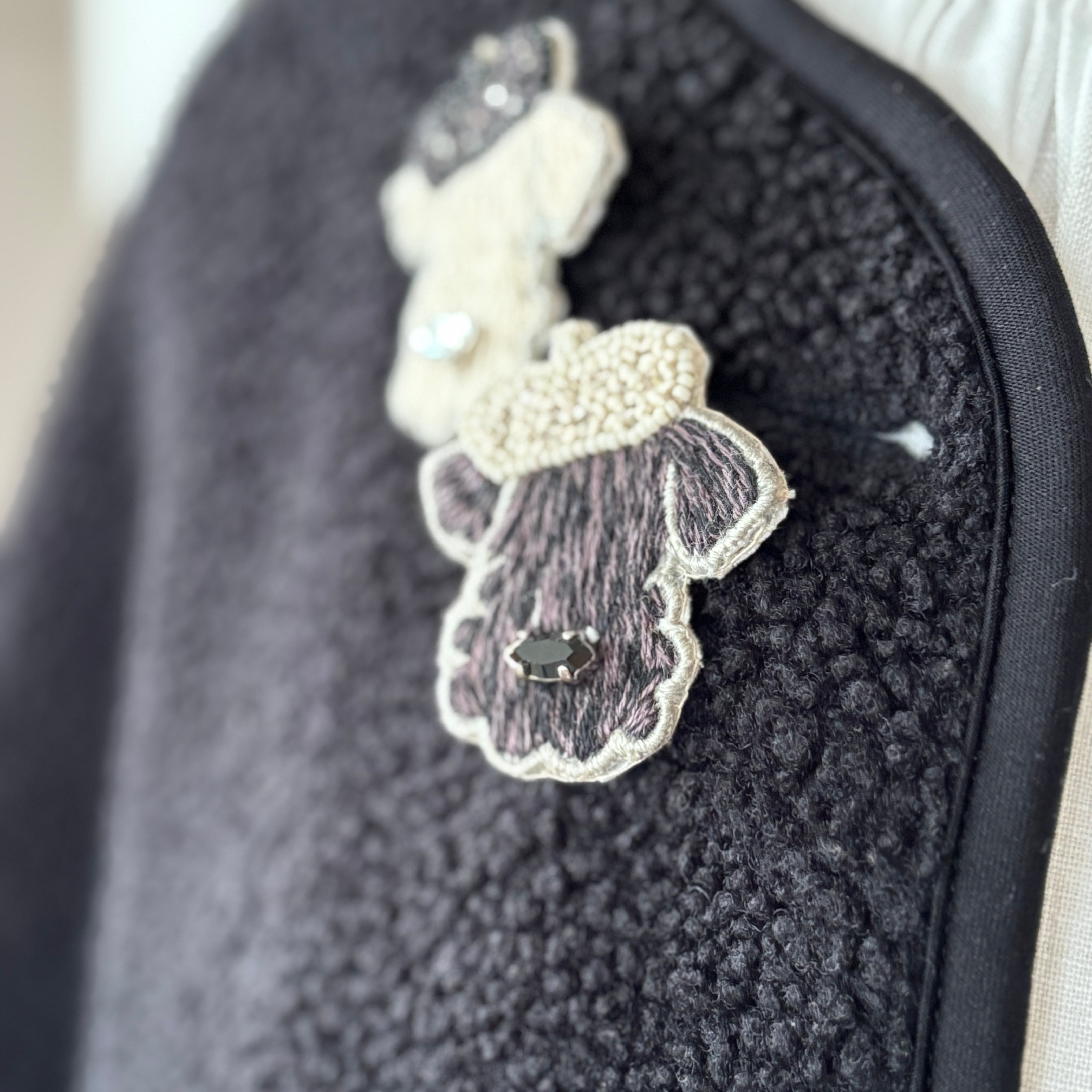 彩り屋の刺繍ブローチ。ベレー帽をかぶったワンちゃんのモチーフ、お鼻のラインストーンが光を受けて、かわいらしい表情を引き立てます。バッグや帽子のワンポイントに、帯留め風に和装のアクセントにもおすすめ。犬好きの方へのギフトにもぴったりです。